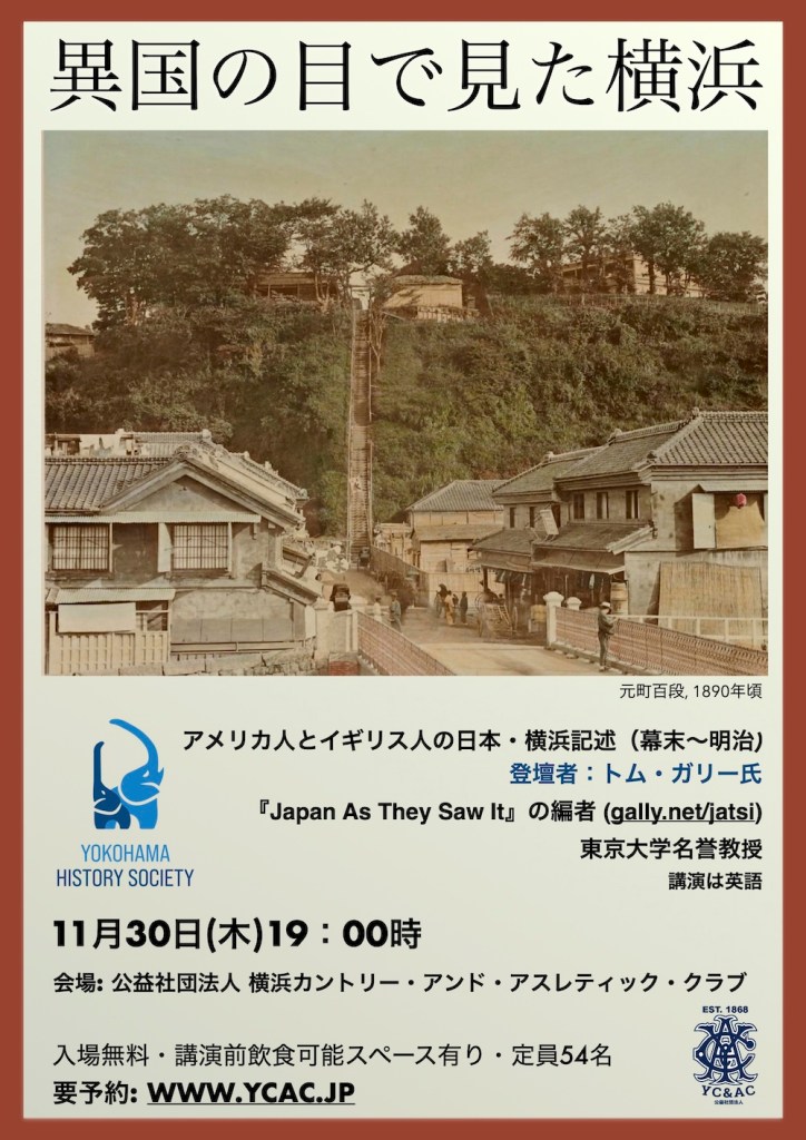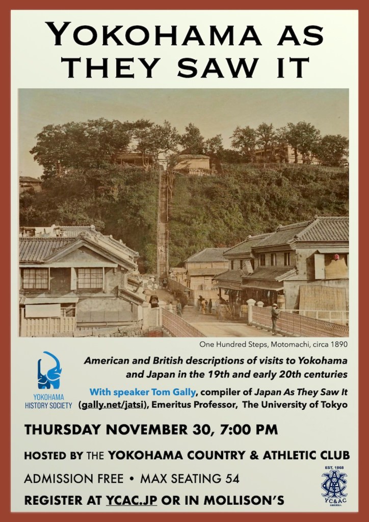On Thursday, November 30, Tom Gally, the creator of Japan As They Saw It, will give a talk on the project, including a discussion of some interesting accounts of Yokohama specifically.