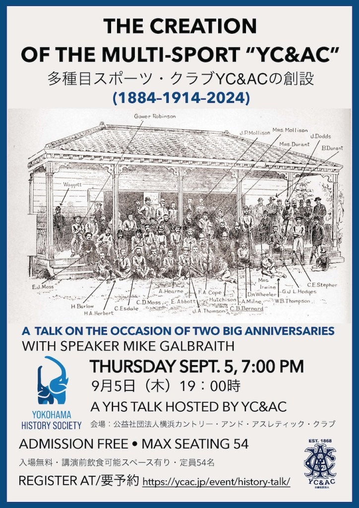 Of course, without an excellent ground and good facilities—at a time when Japan had almost no green playing fields other than the Meiji Jingu ground in Tokyo—the YC&AC could not have achieved what it did. That ground, which YC&AC maintains to this day, was opened 110 years ago, in 1914. The talk will also illuminate this important anniversary.